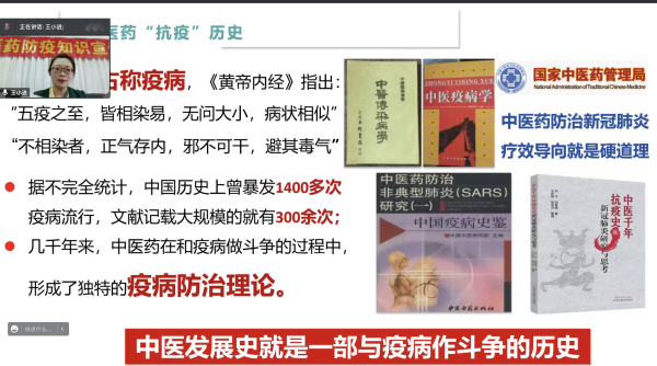 讲座围绕中医药防治传染病的历史、中医药在抗击新冠肺炎过程中的优势及中医药防疫抗疫经验三个方面进行讲解。在讲座结束后,王进进老师与留学生进行了互动,回答了留学生提出的相关问题。